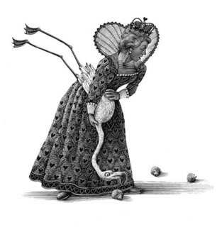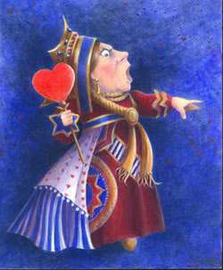 The Queen was always grumpy and liked to play croquet, using a flamingo as a mallet and a hedgehog for a ball. She liked to say, “Off with his head!” at anything that moved. When she saw three gardener cards painting white roses red, she demanded that their heads be cut off. She wanted the same thing for the Cheshire Cat, even though his was only a floating head. Basically, she wanted everybody’s head cut off. It could have been a PMS thing.