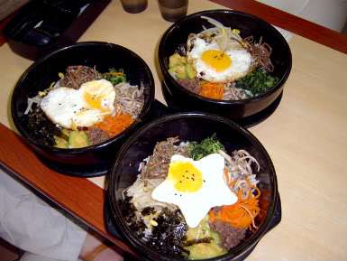 Put the rice, bowl of egg strips and vegetables, and the pan of meat where everyone can reach them. Each person puts a pile of rice in the middle of a soup bowl or plate and some meat and vegetables on top. Top with egg ribbons. If you like spicy food, add some ko-chee-chang (hot pepper paste). Now mix everything together. Serve with kimchee* on the side if you wish.