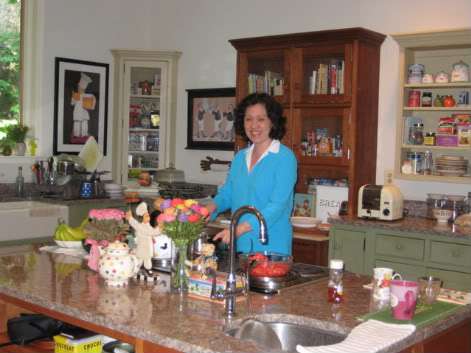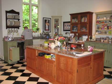 Glad you like my kitchen. What a huge learning experience it was. I got a lot of ideas from browsing through English kitchen magazines — hence the apron front sink, baking center, and open shelving. I love the old kitchens where every cupboard/table is freestanding. It’s fun to match woods, colors, stains, just like you’re thinking of doing. Also I varied counter height — island/stove is lower than standard for easier cooking and rolling out dough, etc.