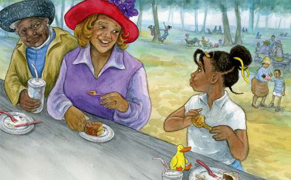 After a delicious lunch of fried chicken, three kinds of cake, and lemonade, Daddy finally convinces Nonie to go on a boat ride. He shows her some wonderful things, including a family of ducks. “Ducklings stick with their families,” he reminds her.