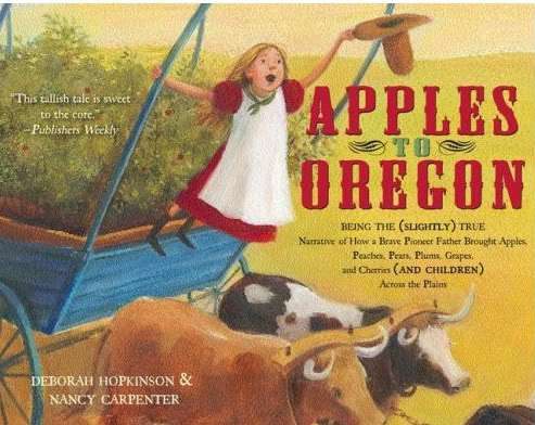 Apples to Oregon, by Deborah Hopkinson, pictures by Nancy Carpenter (Atheneum, 2004). A rollicking tall tale loosely based on the true story of Henderson Luelling, who with his family of eight children, transported 700 plants and fruit trees from Iowa to Oregon by wagon in the 19th century.