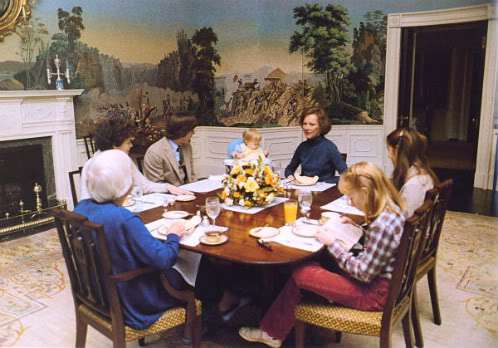 Also on the first floor is a smaller Family Dining Room for more intimate formal gatherings. It is sometimes used as a staging area for state dinners, or as overflow space for guests.