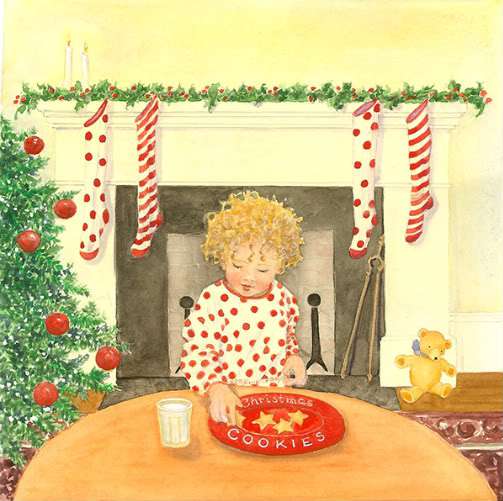 Special thanks to R. Michelson Galleries for permission to post interior spreads from Christmas Cookies. All images included here are available for sale (watercolor on paper, 8.5″ x 8.5″). Click here for more information on these and other illustrations from Jane Dyer’s books.