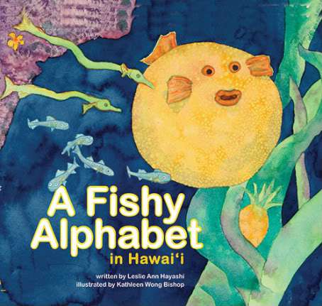 A Fishy Alphabet in Hawai’i (Mutual Publishing, 2007), is my fave Hayashi/Bishop book. Um, maybe I’m just a tad partial to alphabet books. You think? But this one just makes me happy all over. This usually happens when I’m confronted with page after page of vivid, pulsating, color-drenched pictures teeming with life. Thank you, say my eyes. We can’t get enough of those sizzling orange-reds, seaweed hunter greens, and shocking lemon yellows. And dang, did you notice all those fishy facial expressions?