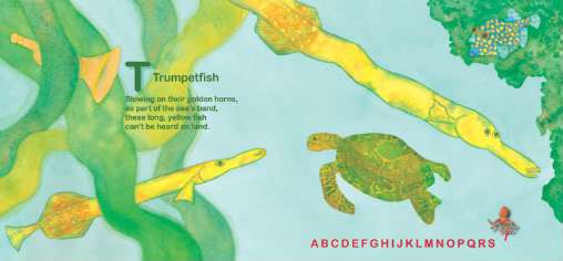 Then, they’ll have a ball looking for the fun surprises on each page — objects not usually found in the ocean hanging out on their corresponding alphabet pages simply because they want to: an angel mermaid patting an angelfish, an Easter egg nestled on a rock ledge tempting an eel, a volcano rumbling near a velvetfish, even a lonely zucchini teasing the zebra rockskipper. A list of hidden words at the back of the book is great for building vocabulary and prompting closer observation.