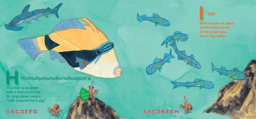 For each letter, a different fish — gliding, wubbling, darting through the slippery pages of this book. Most go by their common names — Pufferfish, Eel, Angelfish, Moorish Idol — but there’s one scientific gilly in the bunch, Xyrichtys Pavo, to keep all the others in line, and of course there are a few rascals who like to show-off their Hawaiian names — ‘Iao, Kikakapu, and the infamous Humuhumunukunukuapua’a. (Say that three times and you get extra chocolate.) Onaga, who likes his Japanese name instead of his Hawaiian (ula ‘ula) or common name (red snapper), is the tastiest one of the bunch.