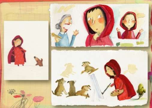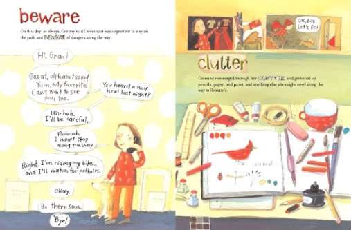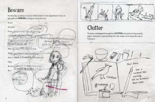 That came out of the idea of making the book an abecedarian. When I thought about the granny’s character, I knew I didn’t want the wolf to eat her and that Carmine would go to her house for some great meal. I still associate my grandmother’s home with food. The alphabet soup came out of that — the perfect food for an alphabet book. Then the pasta letters help hammer it home.