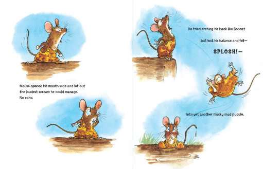 Seriously. For me, this one stole the big cheese. Linda’s telling demonstrates picture book writing at its finest. At the center of the storm is Mouse — tiny in size, but experiencing a rage so huge, he’s hoppin’, stompin’, screaming, rolling-around-on-the-ground mad. As he struggles to express his anger, Hare, Bear, Bobcat and Hedgehog come along and show him how it’s really done, but poor Mouse can’t get it right, flopping, splooshing and splushing into one mucky mud puddle after another.