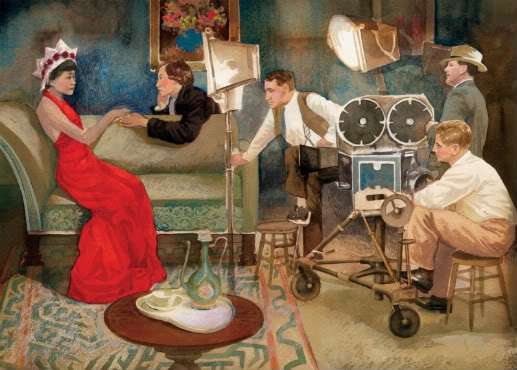 Lin Wang, a classically trained portrait artist, has brought this compelling narrative to life with luminous, ravishing watercolor and acrylic illos. The spreads are lush and rich, echoing the grandeur of movie sets. The likeness to the real Anna May is startling and mesmerizing; she is often clad in intensely emotional tones of deep red, plum, orchid, or pumpkin, and the last spread of her sitting at a table with her striped jacket and floral hat is simply gorgeous.