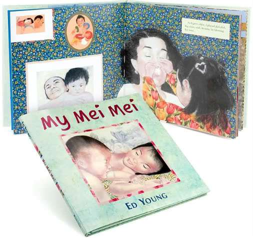 MY MEI MEI by Ed Young (Philomel, 2006). This is the true story of how Ed Young and his family went to China to adopt a little sister, or “mei mei” for his daughter Antonia, and how she learned to be a big sister to little Ananda. Told from Antonia’s point of view, it traces the significant moments of this sibling relationship — starting from when Antonia first asks for a little sister, to them flying the “friendly sky” to China, to seeing Ananda for the first time, to experiencing jealousy and realizing “she was not all she ought to be” (requiring special teachers to learn to walk and talk). There is love and warmth in the simple yet significant ways the sisters eventually bond, and the gorgeous gouache, pastel and collage illustrations render the experience with such luminosity it takes the breath away. That I can feel a father’s love in every aspect of the story’s execution only deepens my veneration for it.