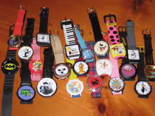 TIMEPIECES: Clocks and watches are intriguing (especially the haunted ones that work backwards)! Many are beautiful pieces of art, and they all have a practical purpose. Oh, those little gears and wheels and pieces working together with such precision, keeping track of the seconds and minutes and hours of our days. Amazing! What would we do without our alarm clocks? The beauty of old grandfather clocks chiming every hour on the hour, the family heirloom mantle clock, Big Ben, the gold clock with the glass globe and three little balls that rotated one way, then the other. Tick tock, tick tock. I collect character wristwatches, and should own stock in battery companies. At least I’m usually on time for appointments!