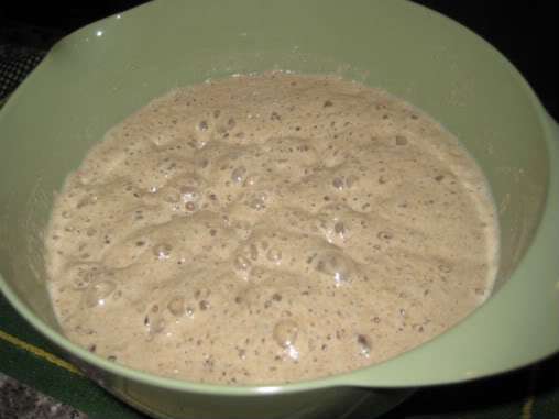 3. Stir the oatmeal, flour, and salt into the milk and yeast mixture. Add more water, if necessary, to make a batter. Cover the bowl with a damp towel or plastic wrap and set it aside in a warm place for about an hour.