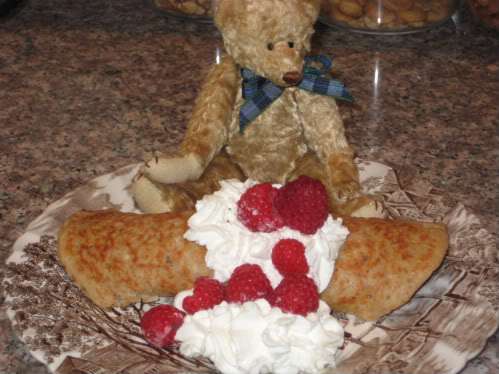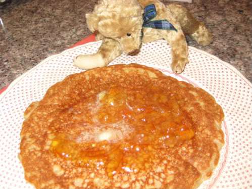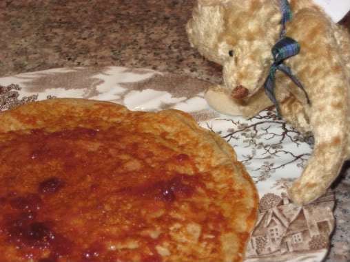 Of course I had to try making some of my own. I love pancakes in general, but never made any using oat flour. The recipe from Inside the Secret Garden calls for a blend of whole wheat flour and finely ground oatmeal and yeast! It was easy to make, though you need to plan ahead, since the batter has to rise for about an hour before cooking on a griddle. Of course, the bears ate them with marmalade, raspberry jam, and maple syrup. Oatcakes can also be rolled and stuffed with savory fillings like cubed ham or cheese. I do like this recipe and will definitely make it again.