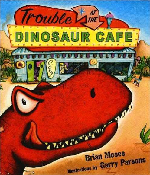 TROUBLE AT THE DINOSAUR CAFE by Brian Moses, pictures by Garry Parsons (Walker & Company, 2006). Uh-oh. Readers with prehistoric appetites who like their meals flavored with danger and suspense will gobble up this terrifying tale. A bunch of peace loving plant eaters must contend with ravenous Tyrannosaurus, who after reading the menu and eating it, decides he must have MEAT! Growling and threatening Steggy, Iggy and Patty with instant extinction, he is eventually brought to his knees by Terry Triceratops, who saves his friends from becoming dinosaur stew. Parsons uses perspective to great effect in capturing the gigantic terribleness of Tyrannosaurus, and the facial expressions of the other dinosaurs convincingly depict fear, determination, and finally victory. Told in rhyming couplets, this will make for a highly dramatic read aloud, with a big laugh at the end. Readers will definitely ask for seconds.