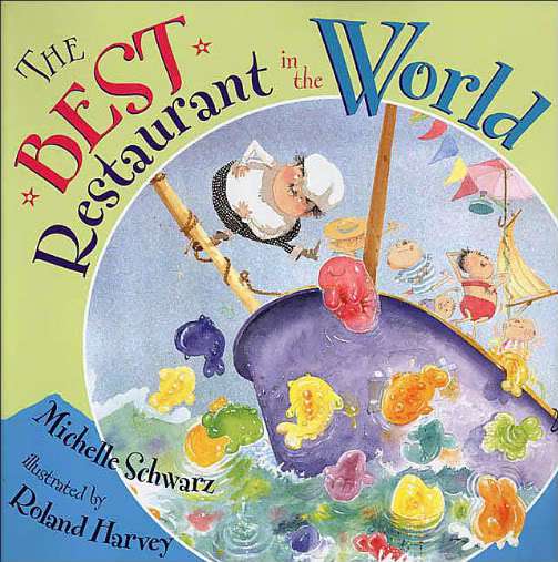 THE BEST RESTAURANT IN THE WORLD by Michelle Schwarz, pictures by Roland Harvey (Dutton, 2002). The perfect antidote for boring restaurants serving boring food and filled with boring conversation is the Super Sailing Sea Restaurant. Be patient, wait on the beach, and if you’re lucky, little round Chef Peppi will come ashore in his tin tub to pick you up for a feast beyond your wildest dreams: cotton candy clouds, fish made of Jello tasting like anything you could wish for, floating chocolate castles, and a special dessert that can only be found at the bottom of the ocean (seaweed sprinkled with jimmies — salty, sweet, colorful and round). Harvey’s droll, highly detailed pencil and watercolor illos are ice-creamy delicious. An Australian import that will set imaginations soaring.