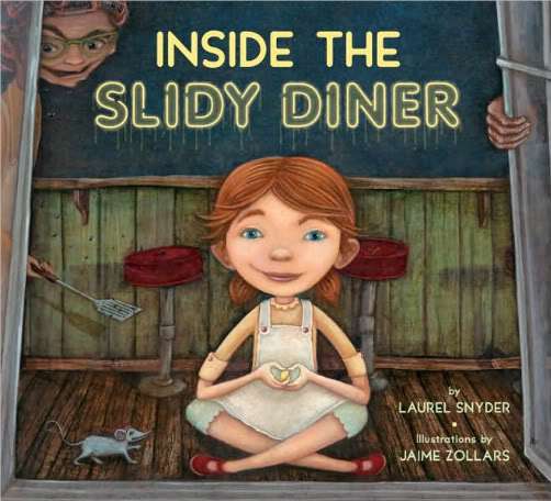 INSIDE THE SLIDY DINER by Laurel Snyder, pictures by Jaime Zollars (Tricycle Press, 2008). Deliciously disgusting in all its greasy, slimy, insect-ridden glory, the Slidy Diner is a must stop if you’re in the mood for an unforgettable meal. Join Edie, who transgressed over a stolen lemon drop and is happy to describe the place, the customers, and the food (?) she knows all too well. On the menu: recycled sticky buns covered in bugs, pumpkin asparagus pie with unidentified crunchy-bit topping, Greasily Niblets, hive-inducing coffee, ladyfingers and the house specialty, Lumps and Dumplins. Compelling, highly original and darkly comic, strange is as strange does. Every word works, the illos take us beyond, and we’ll never know — real or imaginary? Brilliant work by two former waitresses; definitely not a chain restaurant ☺! (Faboo review at 7-Imp.)