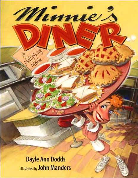 MINNIE’S DINER: A MULTIPLYING MENU by Dayle Ann Dodds, pictures by John Manders (Candlewick Press, 2004). If, like the Brothers McFay, you’re itchin’ for some hot cherry pies and some other diner grub, head on down to Minnie’s Diner. There, you’ll delight in this funny, rollicking rhyming tale of five brothers who neglect their chores once they get a whiff of Minnie’s cooking. It starts with little Will, who leaves his cow-milking and follows his nose to the diner, where he orders “1 soup, 1 salad, 1 sandwich, some fries, and 1 of her special hot cherry pies.”