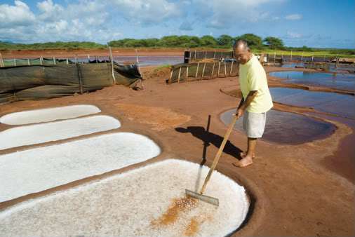 Masa Fujita tends salt beds in Hanapepe, Kaua’i (photo by Shuzo Uemoto).