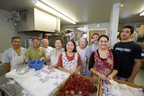 Two Ladies Kitchen in Hilo specializes in mochi and manju (Co-owner, Nora Uchida, center). Photo by Shuzo Uemoto.