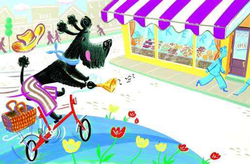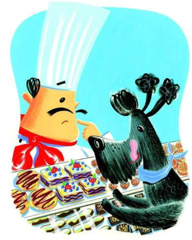 Soon after, bicycle-riding Pantaloon collides with the baker, whose injuries confine him to bed. Pantaloon takes care of him, and fills in at the bakery. He does a wonderful job of icing and delivering the cakes and winning over the customers, but he also remembers his bicycle caused the accident. So, once the baker is well, Pantaloon decides never to show his face in the bakery again. How the customers miss him! The baker realizes he, too, misses the irrepressible, hardworking pastry dog, and comes up with the perfect plan to win him back.