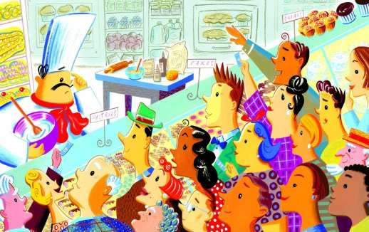 Salerno’s gouache, digitally enhanced illos, by contrast, really pop. They’re full bleed, pulsing with energy and brimming with detail. Salerno includes a much wider variety of pastries, breads and cookies in more kitchen scenes, populates the neighborhood with more people, and whets the reader’s appetite by showing him the bakery window from the very first page of the story. Overall, more expression, more movement, more joie de vivre.