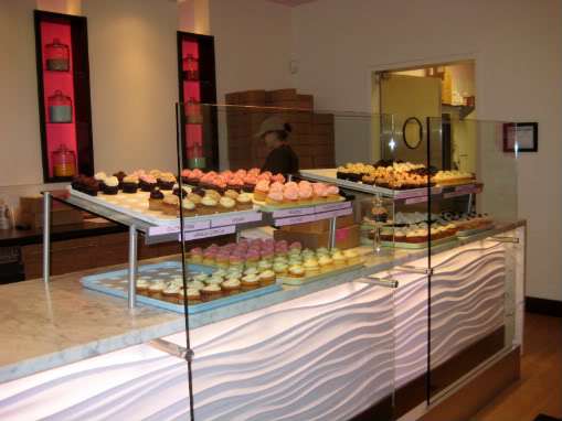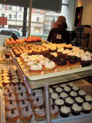 We were the first ones in the shop (they didn’t open till noon), and the guy behind the counter didn’t believe in smiling very much. Come on — you’re selling cupcakes — smiling is a pre-requisite! Now, I had done my homework beforehand, and I had my heart set on their trademark cupcake (Southern Belle), a chocolate vegan/gluten free cupcake called Black Velvet, and B-Day (almond scented butter cake with milk chocolate ganache frosting). “We don’t have Black Velvet today,” muttered Mr. Smiley Pants.
