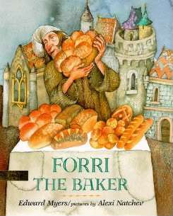 FORRI THE BAKER by Edward Myers, pictures by Alexi Natchev (Dial, 1995). One of the few thin bakers in picture book history, Forri is known far and wide for his incredible variety of breads — root bread, candle bread, pen bread, ice bread, rose bread. At first the villagers of Ettai buy his bread eagerly, but eventually his wild and unconventional culinary creativity makes him an outcast: Forri is crazy! Forri is odd and strange! It’s not until barbarians invade the village and Forri devises an unusual plan to repel them that he’s truly appreciated for his remarkable skills. Natchev’s pencil and watercolor illos in muted tones are wonderfully detailed and textured, suggesting “Old World,” antiquity, folklore. Bread swords, helmets, and armor never tasted so good. A great nod to noncomformity.