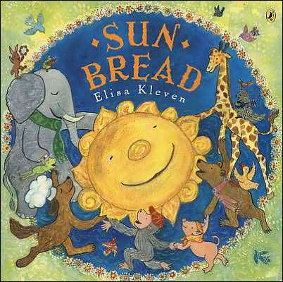 SUN BREAD by Elisa Kleven (Dutton, 2001). Love love love this one! A winter storm is raging which “washed the colors from the world,” and everyone in the village is grumpy about being stuck indoors. A winsome canine baker decides to “bake a sunny feast.” With great love and determination, she shapes “a bread so round and grand . . . It seemed the sun shone in her hands!”