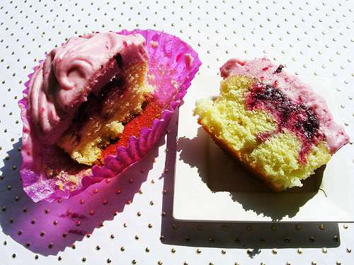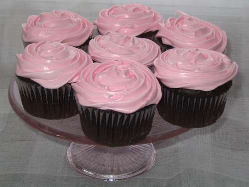 Now, I’m definitely in the mood for a girlie cupcake. Near the end of the book, Stevie makes a batch of what she calls Pink Velvet cupcakes — vanilla raspberry swirl batter with fluffy pink frosting.