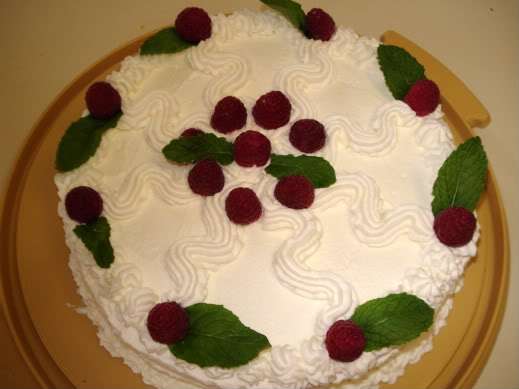 Frost the cake with lightly sweetened whipped cream. Then pipe little rosettes of whipped cream on top. Decorate with fresh raspberries and mint leaves.