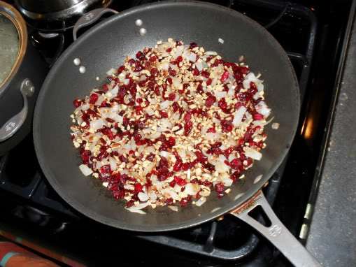 Add almonds and cranberries and continue to sauté until onions are translucent.
