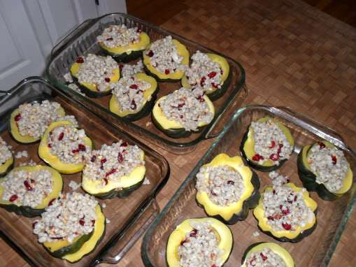 Set squash in glass casserole pan, open side up, and spoon barley mixture into each opening.