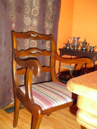 Kelly: The chairs in my dining room belonged to my grandparents, and his chair still sits at the head of the table every night. Interestingly, hubby prefers an armless chair, so it’s as if my grandfather has his own place still, even though he died about 25 years ago.