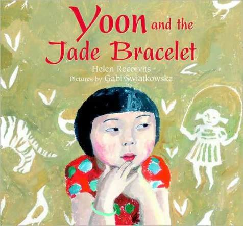 YOON AND THE JADE BRACELET by Helen Recorvits, pictures by Gabi Swiatkowska (FSG, 2008). The third book about Yoon finds her wishing for a jump rope for her birthday. Instead, she receives a storybook about a silly girl tricked by a tiger and a lovely jade bracelet passed down from her grandmother. At school the next day, she is approached by an older girl, who invites her to play jump rope. Wanting desperately to make friends, Yoon happily accepts, but reluctantly agrees to let the girl borrow her bracelet for the afternoon. When the girl refuses to return the bracelet, telling the teacher it is hers, Yoon must find a way to get it back. How will she use her “Shining Wisdom” to outwit the girl “tiger?” Like the other Yoon stories, this believable storyline reinforces the importance of self reliance, with a convincing portrayal of an outsider trying to fit in. Highly recommend all three Yoon books.