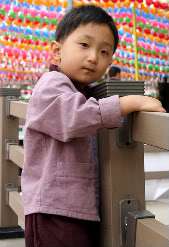 THE TRIP BACK HOME by Janet Wong, pictures by Bo Jia (Harcourt, 2000). In simple, lyrical prose, a little girl describes a trip she and her mother take to visit her family in Korea. They first shop for gifts to bring with them — a pair of work gloves for Haraboji (grandfather), an apron with pockets like flowers for Halmoni (grandmother), and an alphabet book(!) for Imo (aunt). The newly acquainted relatives spend many halcyon autumn days together, and the girl’s descriptions of how they passed the time — feeding the pigs, shopping at the outdoor market, cooking, eating, playing cards and reading, are luminous and heartwarming. Children will find the “everyday” routine of the gentle, rural life in Korea interesting, recognizing that time spent with loved ones, no matter where they live, overflows with riches. Bo Jia’s realistic watercolor illos are exquisite. I love the market spread showing “clouds of rice cakes and rivers of small soup fish and hills of hot chili peppers!” Wong, who is half Korean, was inspired by a similar trip she took with her mother when she was four.
