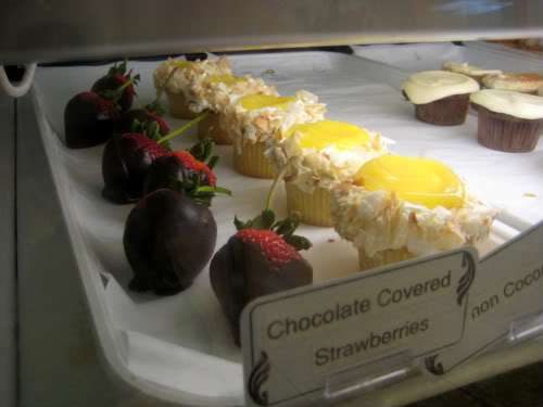 You try to avert your eyes, but pretty little chocolate-dipped strawberries, good-sized eclairs, brownies and cookies, and some decidedly intriguing cupcakes, obviously pleased with themselves, beckon in voices alluring and hypnotic.