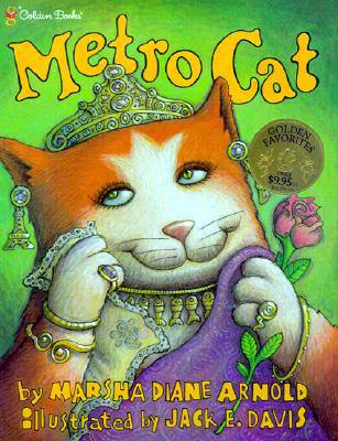 METRO CAT by Marsha Diane Arnold, pictures by Jack E. Davis (Golden Books, 2001). Sophie, a rather spoiled feline who graces the cover of Fancy Cat Magazine, must learn to fend for herself when her limousine makes a fast turn and her cage sails right into the middle of the Metro’s morning rush hour. The “swirling sea of shoes” rushing hither and yon is quite a contrast to her lap-of-luxury life, where she is served trout for breakfast every morning, wiling away the hours napping in her sunroom or playing in a catnip garden. She soon becomes adept at dodging all the slippers, sandals and shoes, and even scrounges bits of baguette, croissants, and crêpes that have fallen to the ground. When she ascends to street level, she meets a down-on-his-luck but kind street musician. The two soon pair up, bringing music and dancing to the Metro. Sophie finds a new friend and discovers the joys of the simple life. Davis’s vibrant, cartoony illos rendered in rich hues extend the narrative with its touches of humor, details of street life, and enchanting array of shoe fashions. Title page includes a fetching illo of Sophie eyeing an éclair. Très bien!