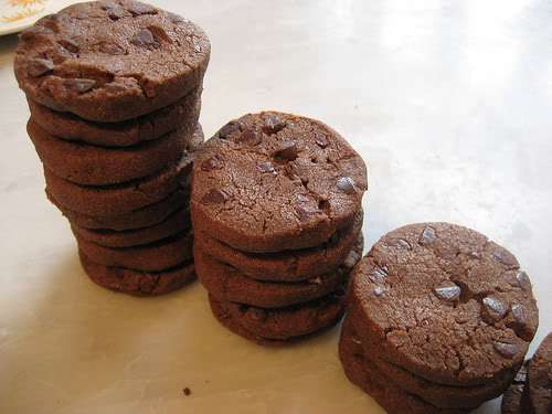 These easy-to-make, easy-to-eat, easy-to-love chocolate-chocolate chip cookies are from Pierre Hermé (see page 56), the man Vogue magazine called “The Picasso of Pastry.” They are cocoa dark, not very sweet, chock-full of chocolate bits, melt-on-your-tongue buttery, just crumbly enough to be true sablés, or sand cookies, and just salty enough to catch you off guard. In fact, the combination of chocolate and salt (Pierre uses the somewhat exotic fleur de sel, sea salt from the Guérande; see page 9) makes these cookies fatally appealing: I don’t trust myself not to finish the batch in a sitting, and I’ll bet you’ll find yourself in the same spot — a warning to make these when you’re certain not to be alone . . .
