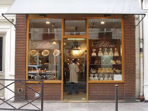 I can remember the first time I went to Jean-Luc Poujauran’s bakery sometime in the 1980’s. I was staying at the other end of Paris, but I made the pilgrimmage happily because I’d heard so much about this young baker. What I hadn’t heard about, and what made me smile with a girlish ear-to-ear grin, was how completely winning the little shop is. Tiny and painted in Provençal blue and cotton-candy pink, it is the kind of shop that makes even grown-ups want to press their noses up against the windowpanes — and many do.