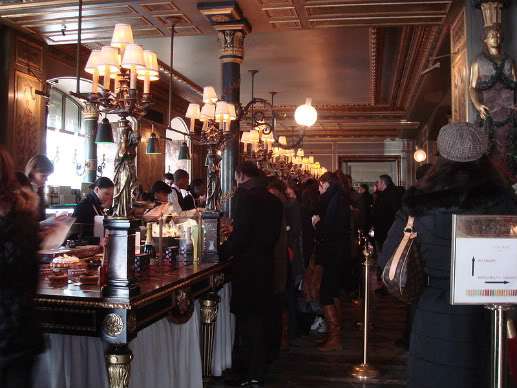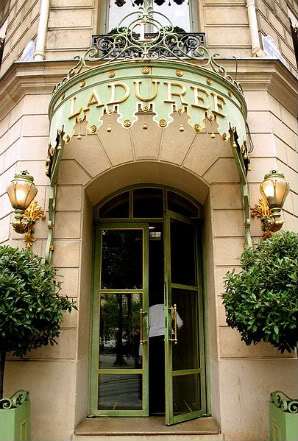 The instant you enter Ladurée, your eyes are drawn to the ceiling. Even the pyramids of macarons (see page 122) and the glossy chocolate creations can’t keep you from looking heavenward at the plump cherubs, rosy pink and properly toqued, pulling fat little cakes out of puffy clouds . . . The angelic chefs preside over a room that is always full, no matter the hour. From their cloud-puff perches, they have a daily view of celebrities and tourists, neighborhood habitués and connoisseurs from every corner of Paris, all being served by waitresses in prim black dresses.