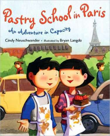 PASTRY SCHOOL IN PARIS: An Adventure in Capacity by Cindy Neuschwander, pictures by Bryan Langdo (Henry Holt, 2009). What better way to learn about math than by whipping up something delicious? Because twins Matt and Bibi show real baking talent with their brownies, their parents decide to visit a cooking school on their trip to Paris. At Les Jumelles Coccinelle International Pastry Academy, Celine is head chef and her twin, Marie, runs the school café.