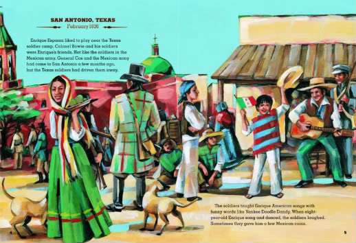 Eight-year-old Enrique took refuge within the walls of the Alamo with his mother, sister, two brothers, and father, Gregorio, who manned one of the cannons. They were Tejanos, Mexicans who had lived in Texas all their lives, and they sided with the Americans (Anglos). Gregorio’s brother Francisco, however, fought with the Mexican army, led by President General Santa Anna. Many other Tejanos faced similar crises when it came to taking sides in the Texas Revolution.
