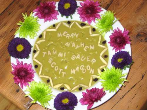 And now, *rubs hands together*, it’s time for our celebration soup! Ooo-whee! But we had fun throwing this concoction together. Got to use up all the surplus mucus, dead bugs, hairballs, and pinky toe clippings laying around the house. Have no fear, friends, it’s FDA approved, snot dangerous at all. Those of you in a particularly monsterly mood, feel free to sneeze right into the bowl. Those in touch with your sweet side, smell the flowers before slurping. Let’s file our fangs and bang our magspoons in honor of Scott and Tammi, Master and Mistress of Mayhem! Congratulations!
