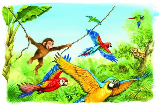 With that snap, our little friend tumbles into a big adventure, playing peek-a-boo and chase with a big frog, riding down the river on the back of a hippo, munching on bananas :9, swinging from vine to vine alongside colorful parrots, and even meeting up with a jungle cat! While Little Chimp is having all kinds of fun discovering many fascinating new things on his own, being away from Mother is also a new experience, so he keeps wondering where she is. But he needn’t worry — as the pictures show, Mother is not far off, keeping a careful eye on him. So reassuring and comforting!