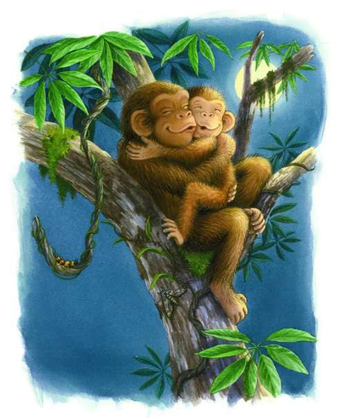Lisa McCue’s gorgeous acrylic and watercolor illos, featuring realistic animals with child-friendly personalities, are a joy to behold. Her visual canvas showcases beautiful birds and butterflies, lush greenery, exotic flowers, interesting insects and reptiles, and day-to-dusk skies in blues and violets — all of which will engage young readers and likely pique their curiosity about jungle habitats. I love Little Chimp’s facial expressions, which perfectly convey his curiosity, wonder, delight and amazement. And the sweet reunion at the end, a blue-ribbon feel-good moment, will likely prompt lots of hugs, cuddles, and requests for repeated readings. This is truly a well conceived book which hits all the right emotional notes. Kids will enjoy looking for Mother Chimp, and feel comforted knowing that even when you are on your own, someone is there for you.