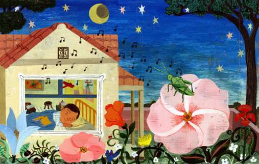 The childlike expression and perceptions are spot on, and the acrylic on illustration board folk art style pictures are festive, richly-hued, lively, and simply gorgeous. The engaging details and textures of the illos amplify the busy, wonder-filled, joyous playfulness of the boy’s everyday life, and will likely prompt readers to look more closely at the things around them and compile a list of their own. And what about this: “For my little brother, who threw mashed peas at my sister and made me laugh so hard I fell off my chair, thanks.” My favorite though, is this: “For the chocolate Dad melts into thick syrup we call warm mud when we pour it on vanilla ice cream, thanks.” Yes, for this lovely book, thanks! Gracias! (Nice review at 7-Imp.)