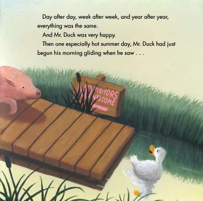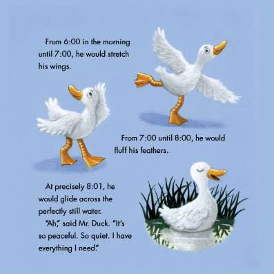 Our friend Mr. Duck, who’s been called “dour,” “disciplined,” and a “fuddy-duddy” (gasp!) by literary critics, loves his strict daily routine, which is marked by blissful solitude and heavenly peace and quiet. “From 6:00 in the morning until 7:00, he would stretch his wings. From 7:00 until 8:00, he would fluff his feathers. At precisely 8:01, he would glide across the perfectly still water.”