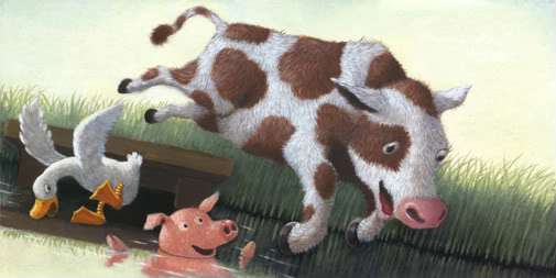 This went on day after day, week after week, year after year, and Mr. Duck was perfectly happy — until one hot summer day, when a careening, cannonballing, presupposing PIG splashed right into his pond by mistake! Holy porkchops! No amount of Mr. Duck’s sputtering and muttering seemed to faze that pond-happy pig. In fact, the acrobatic oinker even invited Cow to jump in and join him.