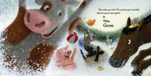 To make matters worse, it was just a matter of time before the entire farmyard stampeded down the dock, each furry and feathered creature diving in for a little water ballet and a raucous game of Marco Polo! It was WILD! LOUD! QUAZY and QUOWDED! Anything but PEACE AND QUIET!