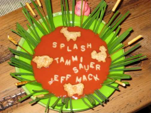 Soup soup soup! It’s time for the soup! The alphabet soup kitchen helpers swam across the Atlantic to collect the finest organic pond scum for today’s broth. No need for silly spoons; just DIVE right into the pond bowl with your mouth wide open. Backstroke, breaststroke, butterfly, or freestyle — whatever wets your whistle! Up for a little soup snorkel? Go for it! Of course, the best way to congratulate Tammi and Jeff is to go totally quazy and QUACK till the cows (and pigs) come home. All together now; stretch your wings and fluff your feathers: WooHoo, MOOOOOOO, and OINK! CONQUATULATIONS!!!